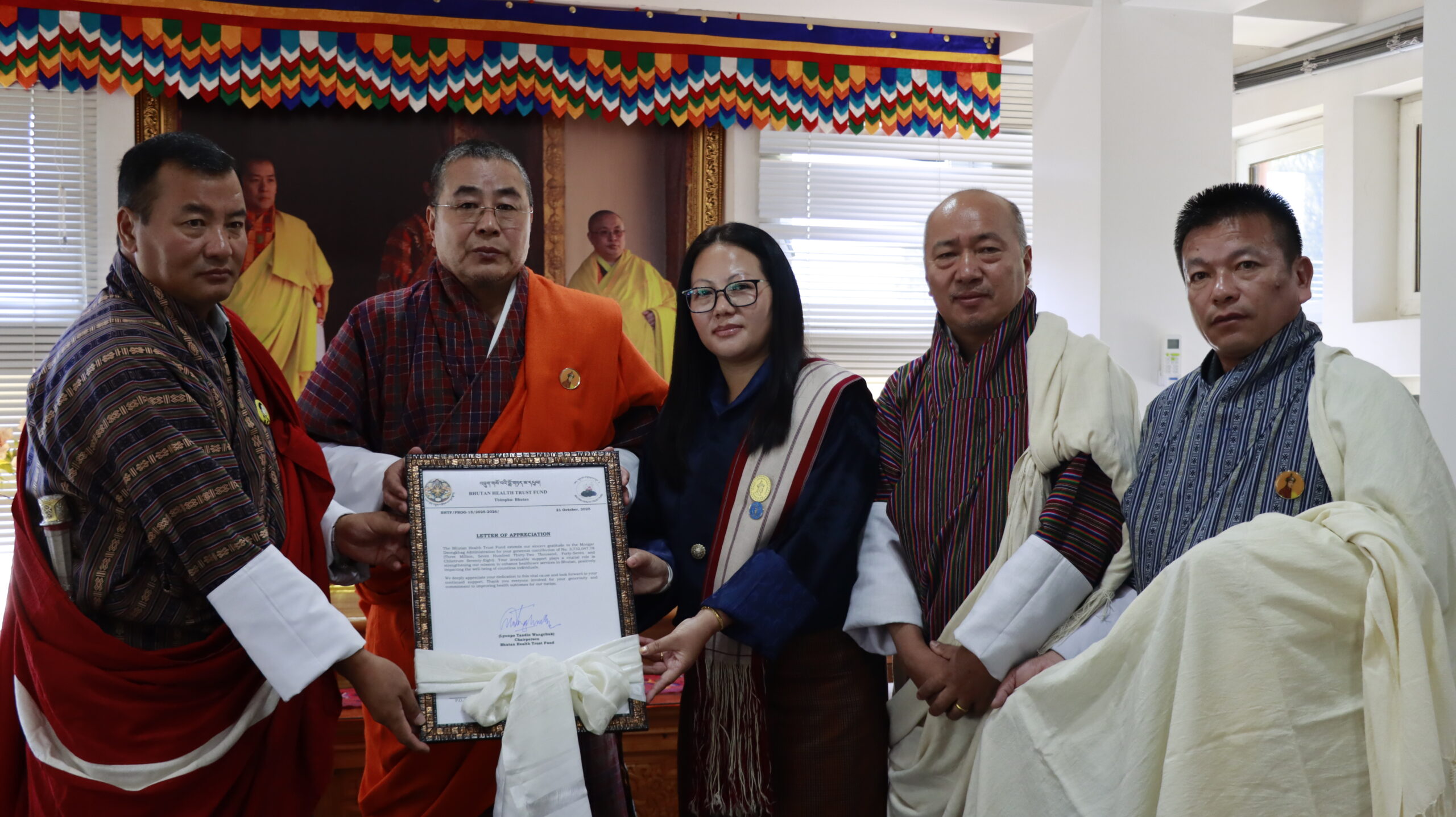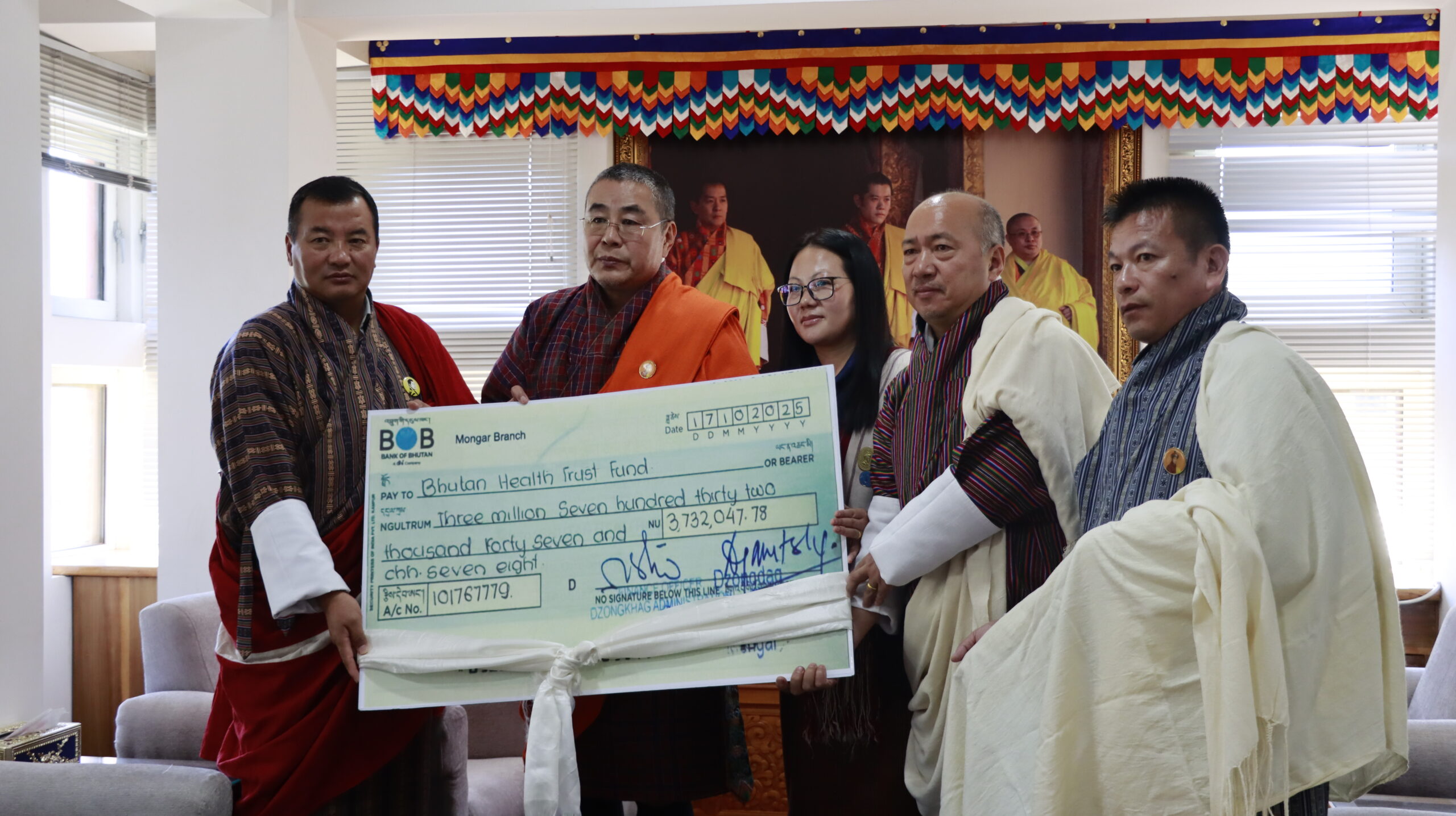On behalf of the Bhutan Health Trust Fund (BHTF) Board, Honorable Chairperson of BHTF, His Excellency Lyonpo Tandin Wangchuk, received generous contribution of Nu. 3,732,047.78 (Three Million, Seven Hundred Thirty-Two Thousand, Forty-Seven and Chhetrum Seventy-Eight) from a delegation led by Dasho Dzongda, representing the people of Mongar Dzongkhag, on October 21, 2025.
